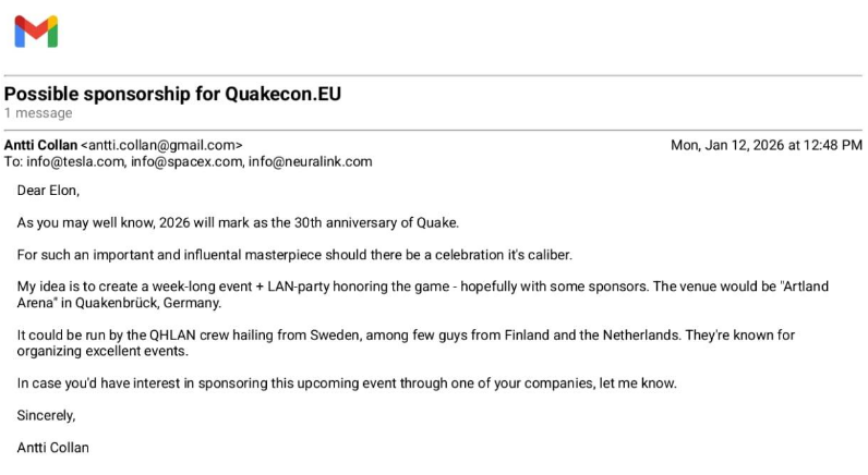 More recently, the event’s long-running connection to Quake’s broader legacy shows up in smaller moments around the LAN: a screenshot shared among attendees this year showed one player tagging Elon Musk with a pitch for a Germany-based “QuakeCon EU” mega-event for Quake’s 30th anniversary. And if you want an earlier example of how far QHLAN’s reach can extend, the QHLAN 2022 broadcast included a short video greeting from John Romero.